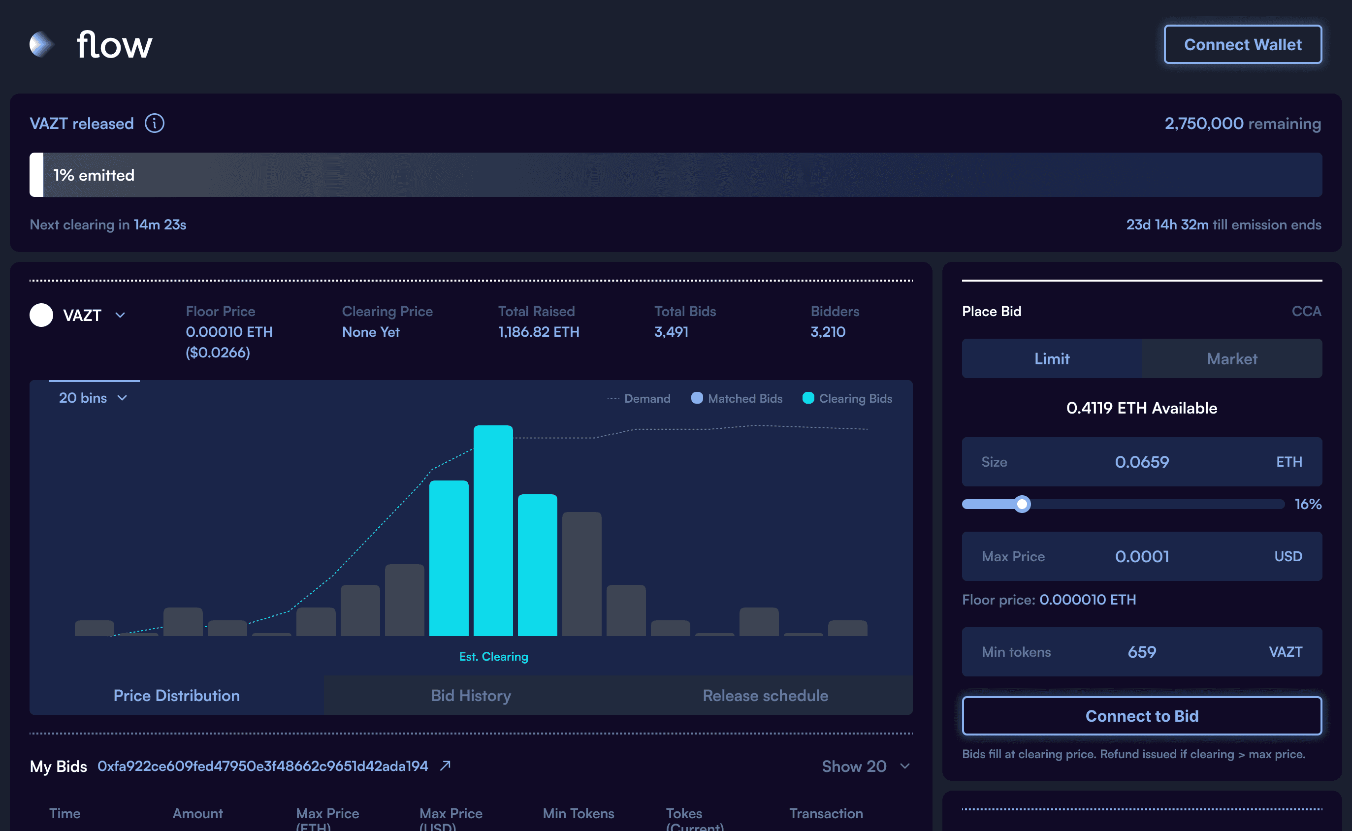 Flow gives teams a clean, modern interface for continuous markets — enabling transparent issuance, real-time pricing, and programmable liquidity.